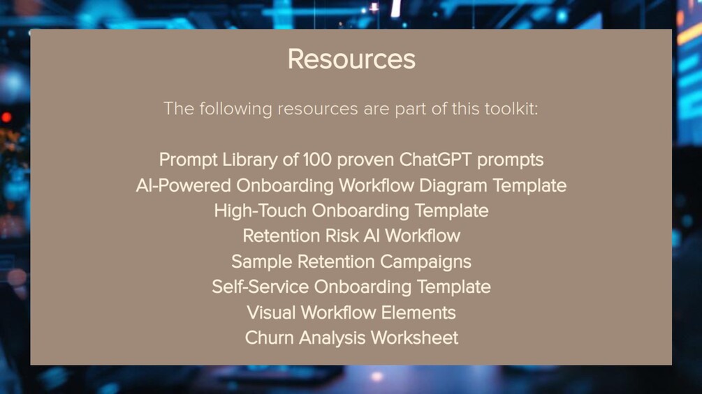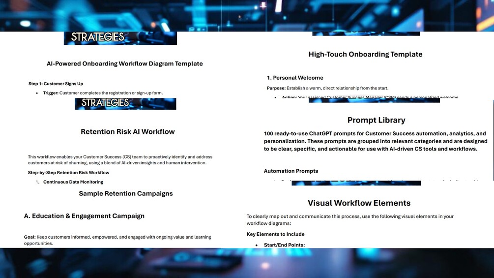 ✔️ Prompt Library of 100 Proven ChatGPT Prompts ✔️ AI-Powered Onboarding Workflow Diagram Template ✔️ High-Touch Onboarding Template ✔️ Retention Risk AI Workflow ✔️ Sample Retention Campaigns ✔️ Self-Service Onboarding Template ✔️ Visual Workflow Elements ✔️ Churn Analysis Worksheet