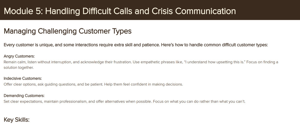 Comprehensive: Covers every step, from initial call handling to advanced objection resolution, crisis communication, and continuous improvement.